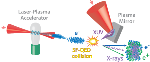Figure: Schematic diagram of a collision experiment between a relativistic electron beam generated by laser-plasma acceleration and a laser beam boosted in intensity using a plasma mirror with the aim of reaching the strong field QED regime with signatures such as the generation of gamma photons or positrons.